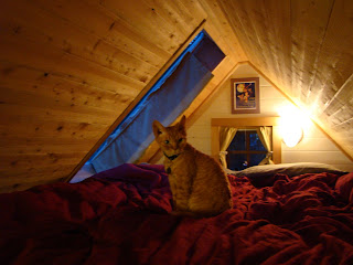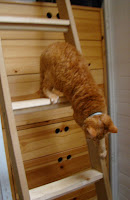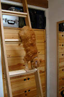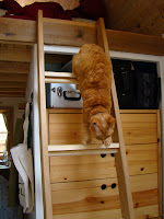 Another project was adding flat rungs to the ladder Brittany had built. She did a great job creating a safe ladder: the angle is nice and it hooks over a little lip at the bottom edge of the loft so that it won’t slip out from under you. But it had round rungs which are a little uncomfortable for my feet and impossible for my cat Raffi to use. He’s pretty savvy with ladders, but the round rungs were unmanageable, so I decided to add flat rungs to make it more workable for both of us. The result is a Raffi-approved ladder that will allow both of us to climb up to the sleeping loft safely and easily.