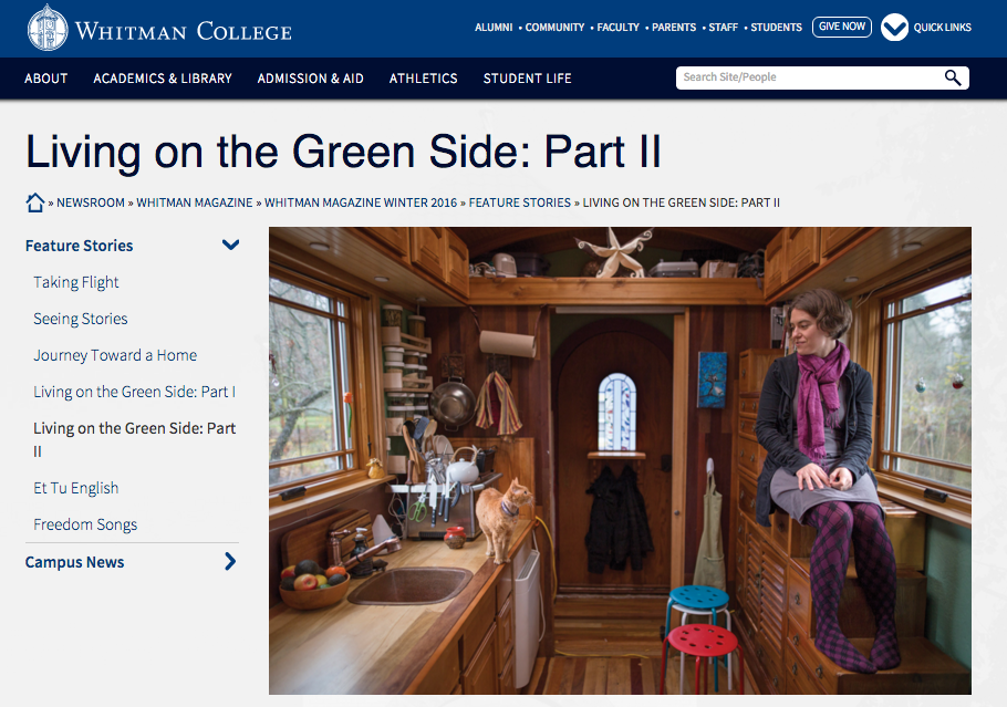 It was a pleasure to have a chat a couple months ago with Sierra Dickey ’15, a fellow graduate of Whitman College who wanted to write a story about me and my little house, The Lucky Penny, for an upcoming edition of the Whitman Magazine. Even more exciting, my old friend Matt Zimmerman Banderas ’04 who is a very talented photographer, was assigned the job of coming to my tiny house community, Simply Home Community to take photos for the story. The story, called Living on the Green Side, just went live and I’d love to share it with you. Thank you, Sierra and Matt, for helping me share my story and thank you Whitman for the people and experiences you provided that have helped me live this happy little life!