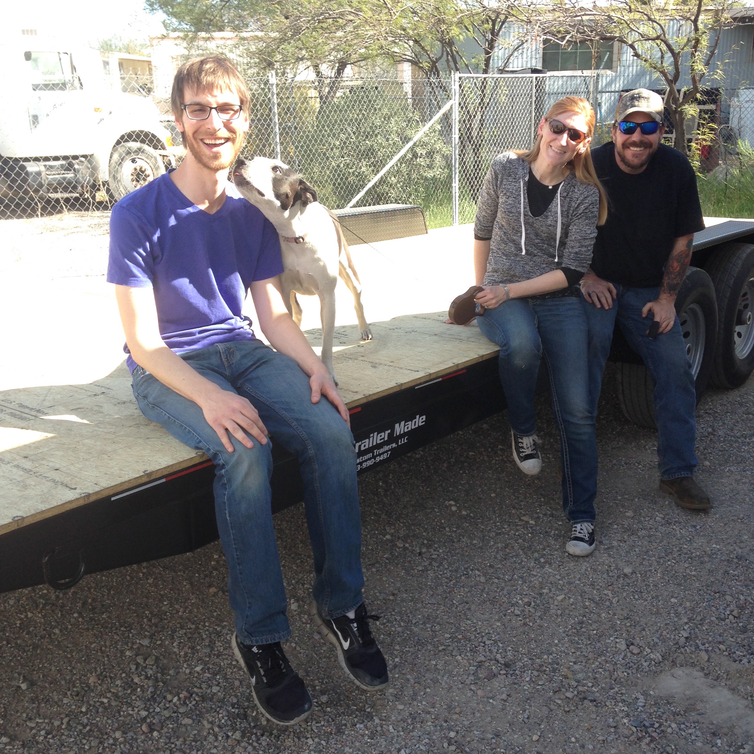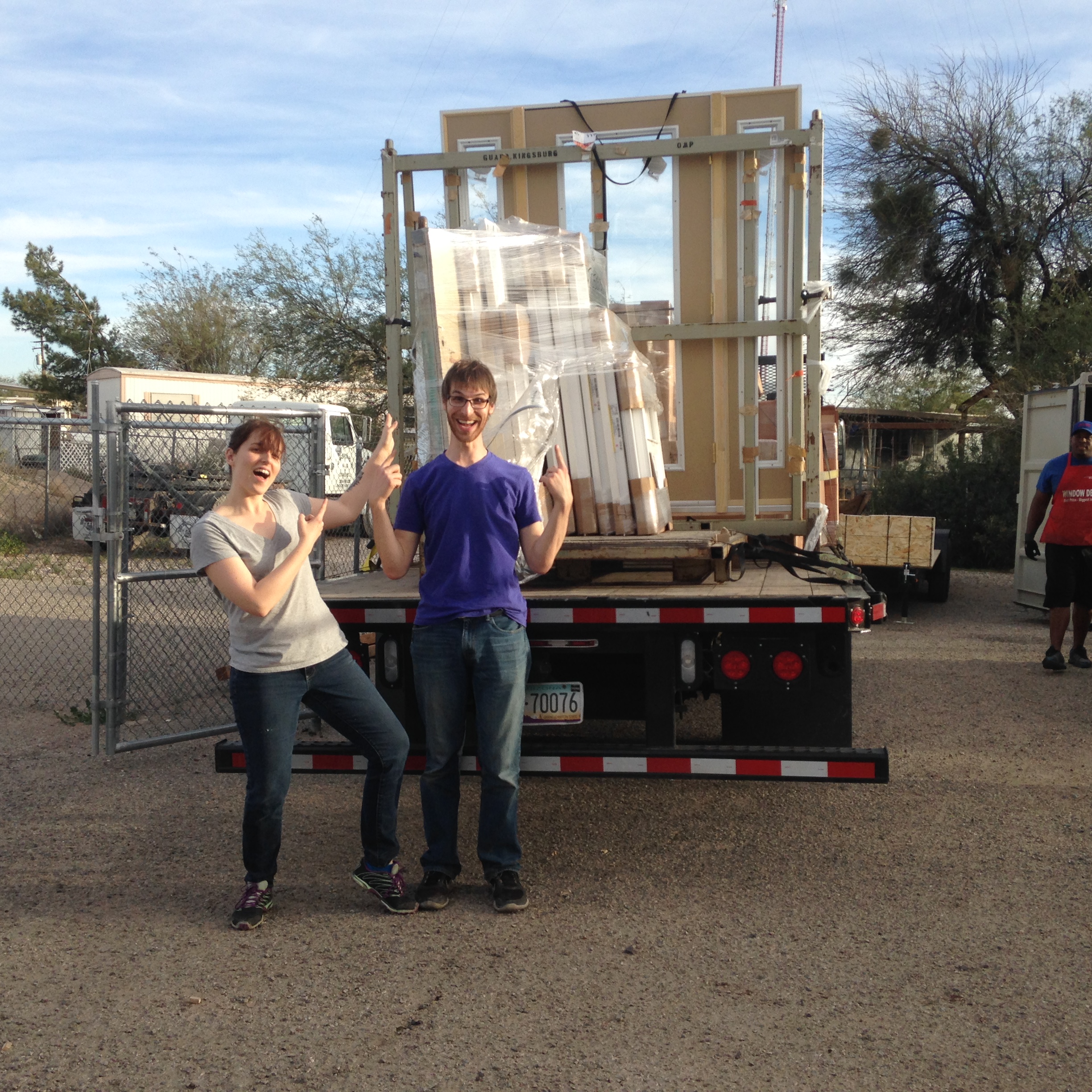 Damon and Natalie of Trailer Made went the extra mile (literally!) to ensure an on-time delivery for the trailer, driving it themselves from Denver to Tucson. I met them at Tiny House Jamboree last summer so it was a delight to see them here in a different context. Kurt was as swoony about his new trailer as Natalie and Damon’s dog Ruby was about Kurt! We admired it for a while, Kurt walking around “in” his new house to get a feel for how it will be in now that he has a life-size foundation. I told him that the house will go from seeming really big to really small to really big again as we add the layers. The window delivery from Window Depot arrived shortly after Courtney did and it was especially exciting to see the tiny windows that will go in Kurt and Courtney’s “away room.”
